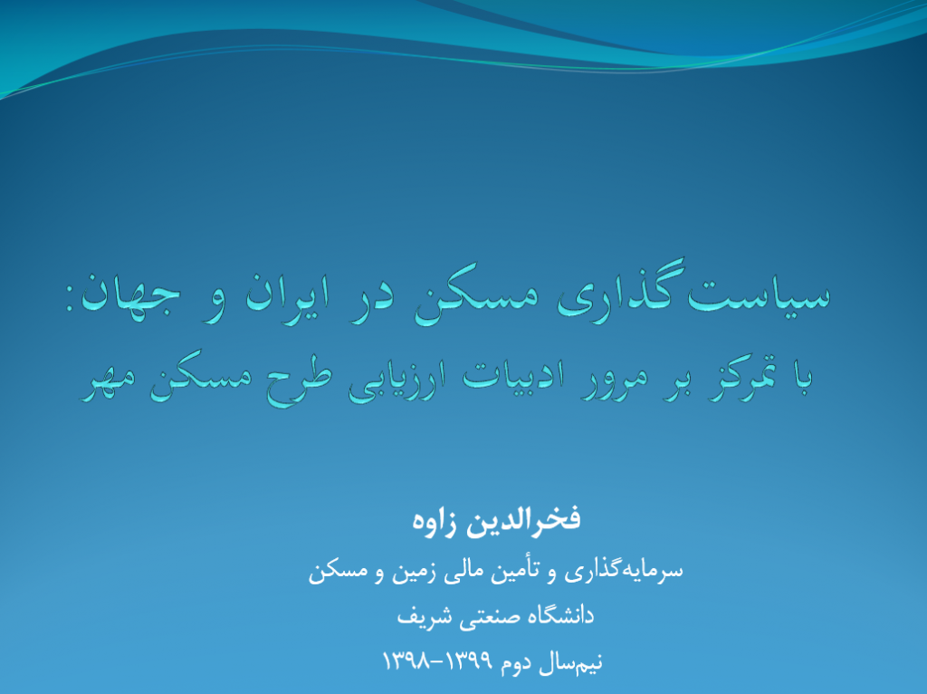 در این اسلایدها، ضمن اشاره به سیاستهای مسکن، خلاصهای از رویدادهای مرتبط به «مسکن مهر» ارائه میشود. دکتر زاوه تلاش کرده تا از مقالات تحلیلی مختلف، نکات قوت و ضعف مسکن مهر را نشان دهد و قضاوت بیطرفانهای از آمار اقتصادی و اجتماعی آن ارائه دهد. [slideshare id=235115392&doc=maskanmehr-200606112315]