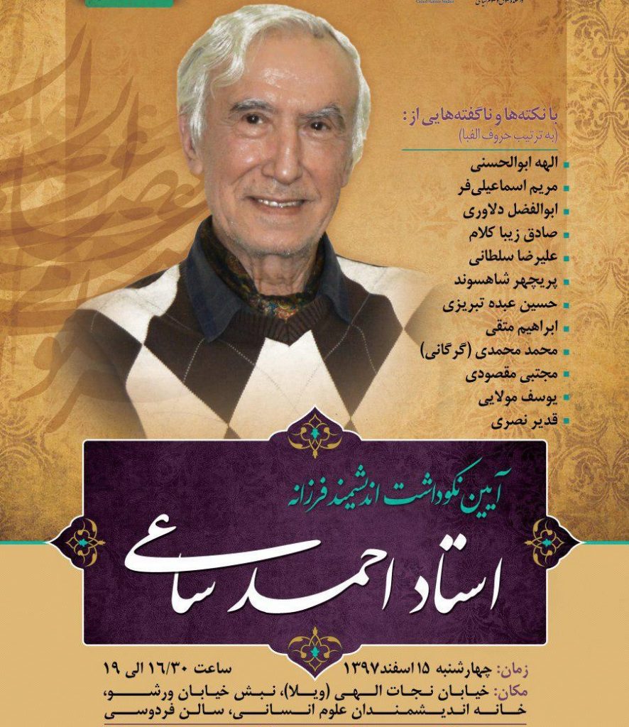 در رزو چهارشنبه ۱۵ اسفند ۱۳۹۷، مراسمی در خانهی اندیشمندان علوم انسانی در بزرگداشت احمد ساعی، استاد علوم سیاسی دانشگاه تهران تشکیل شد. در این مراسم که عدهی زیادی از چهرههای سیاسی و دانگاهی شرکت داشتند، سخنرانان متعددی در مورد این استاد و خدمات ۴۰سالهی ایشان به دانشگاه صحبت کردند. علاوه بر سخنرانان مذکور در […]