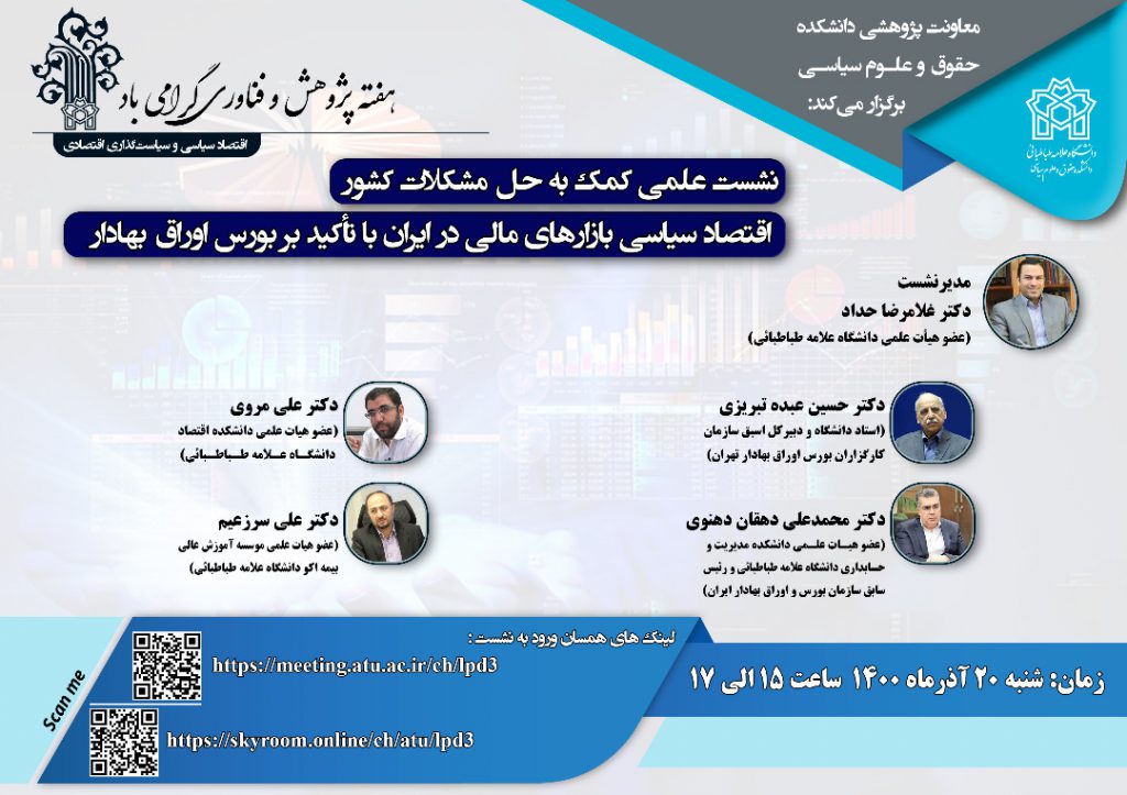 در روز شنبه ۲۰ آذر ماه ۱۴۰۰، حسین عبده تبریزی در نشستی به دعوت معاونت پژوهشی دانشکدۀ حقوق و علوم سیاسی دانشگاه علامه در هفتۀ پژوهش و فناوری شرکت کرد تا پیرامون موضوع «اقتصاد سیاسی بازارهای مالی در ایران» صحبت کند. پوستر بالا دیگر سخنرانان این نشست را نشان میدهد. روزنامۀ دنیای اقتصاد فشردهای از بحثهای […]