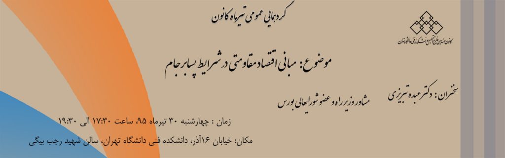 روز چهارشنبه ۳۰ تیرماه ۱۳۹۵ حسین عبده تبریزی در گردهمایی عمومی تیرماه کانون مهندسین فارغالتحصیل دانشکدهی فنی دانشگاه تهران شرکت کرد و سخنرانی با موضوع “اقتصاد مقاومتی در شرایط پسابرجام” ارائه داد. اسلایدهای این سخنرانیای را اینجا میتوانید بیابید.