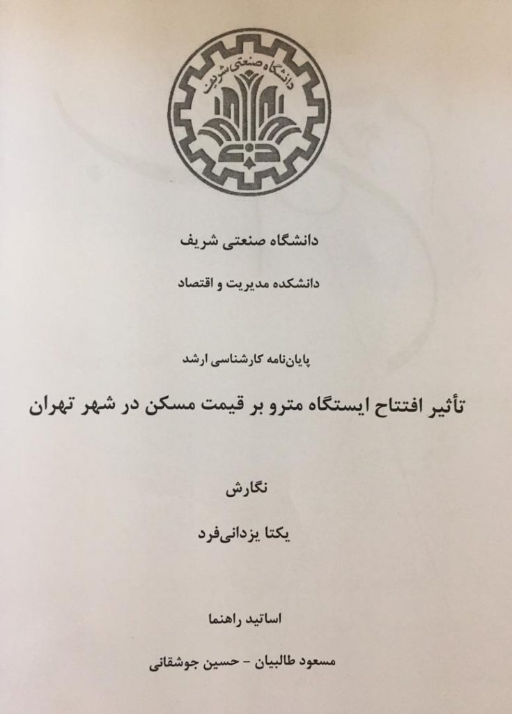 پایاننامه آقای یکتا یزدانیفرد با عنوان ʺتأثیر افتتاح ایستگاه مترو بر قیمت مسکن در شهر تهرانʺ